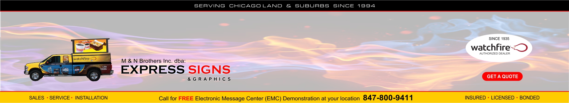 We are specialize in vibrant full printing banners, custom design led front-lit back-lit channel letters, Electric signs, pylon signs, neon and cutting edge Electronic Message Center (EMC) "Watchfire" made in USA.